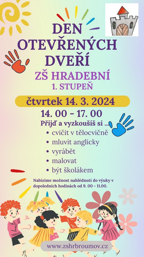 ZŠ Hradební Broumov vás zve na den otevřených dveří, který se bude konat ve čtvrtek 14. 3. 2024 od 14 do 17 hodin. Dopoledne je také je možnost nahlédnutí do výuky (9-11 hod.).