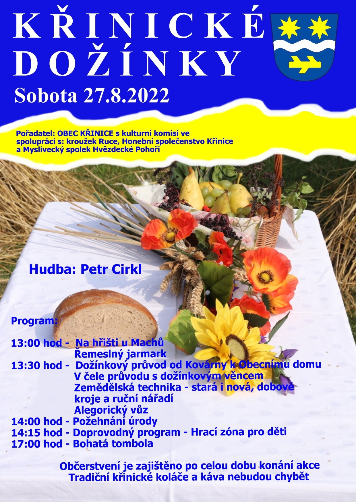 Srdečně Vás všechny zveme na tradiční Křinické dožínky dne 27.8.2022 od 13 hodin na hřišti u Machů, dožínkový průvod půjde od křižovatky v 13,30 hodin.